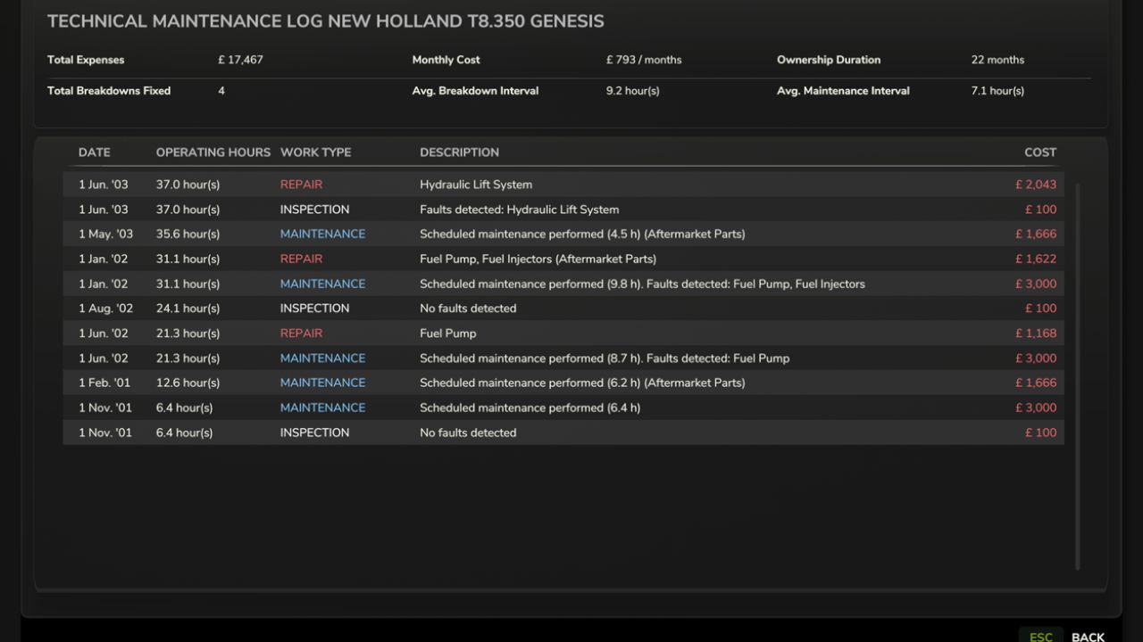 The workshop menu now includes inspection, repair, maintenance, and overhaul. Every procedure takes real in-game time, so repair planning becomes part of normal vehicle management.