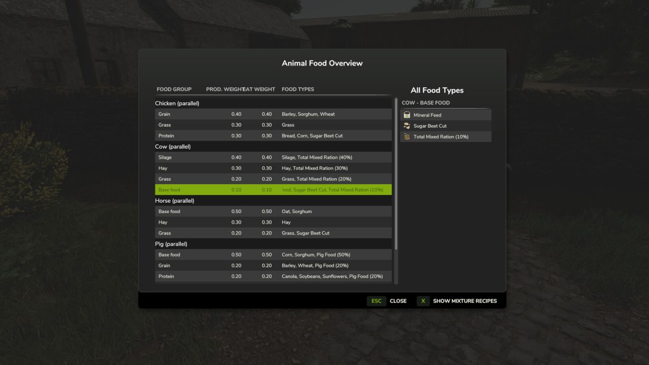 Customizable animal food via mod. The consumption ratios (eatWeight) and production coefficients (productionWeight) can be individually adjusted in the animalicFood.xml file. TotalMixRatio is now also considered a “real” , and it fills the individual feed categories according to the .
