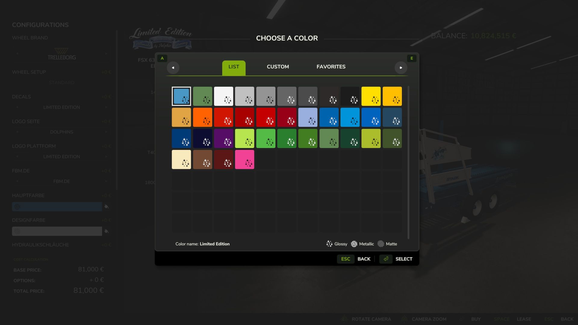– color selection for main color, design color, hydraulic hoses, decal, and rim color;