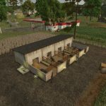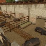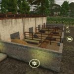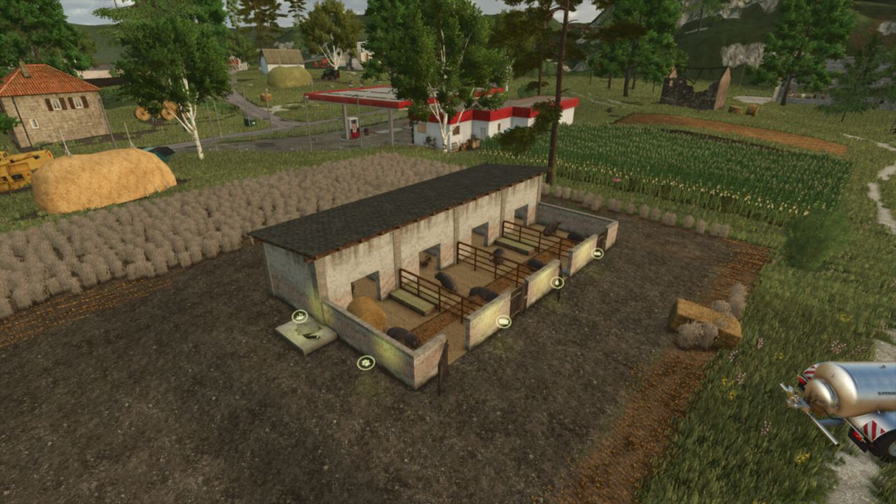 The barn needs feed, water, and straw. Manure accumulates in the barn and is removed with a wheelbarrow and shovel. Alternatively, it can be disposed of with a manure spreader, which is placed in front of the barn door and fills automatically.