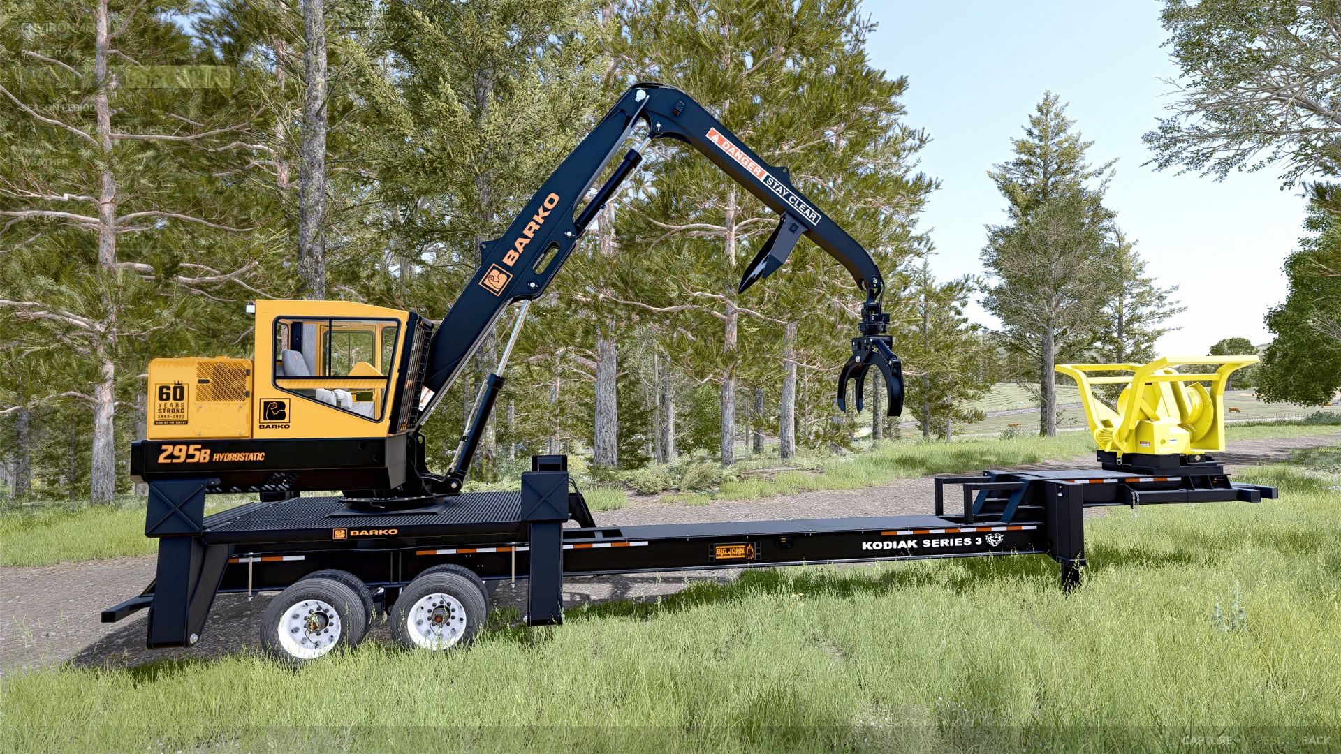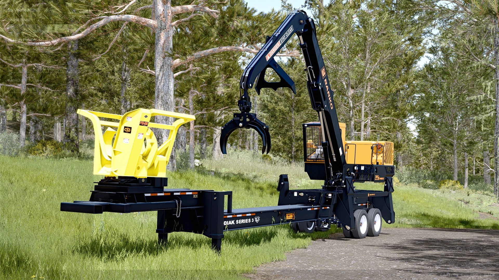 The Barko 595B is log grapple, mounted on a trailer and has outriggers and other moving parts.