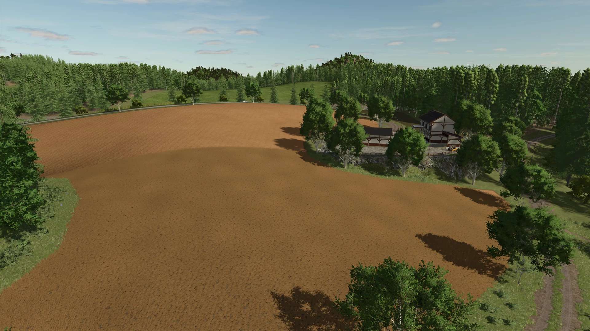This fictional map for Farming Simulator 25 takes you to a hilly and diverse region. The area is divided into two valleys connected by several tunnels, creating exciting roads and a particularly varied landscape.