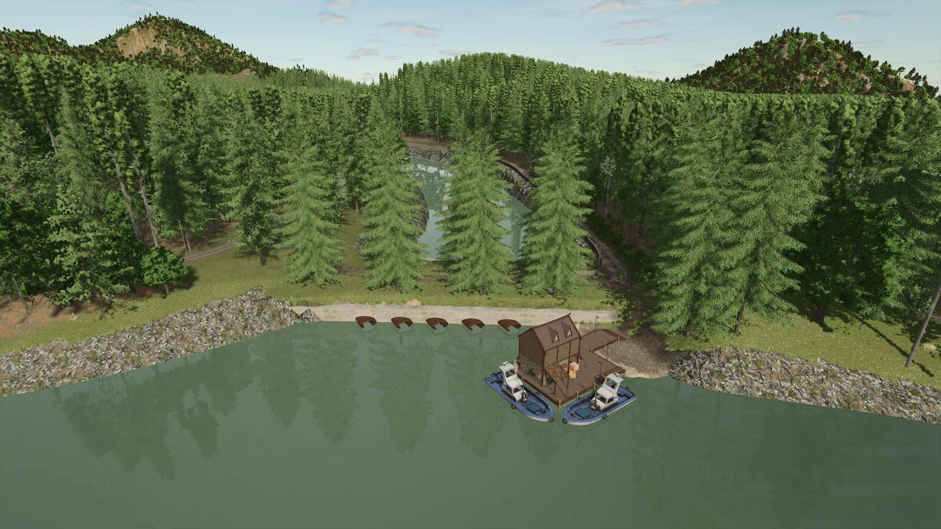 Welcome to Eichenbach! This fictional map for Farming Simulator 25 takes you to a hilly and diverse region. The area is divided into two valleys connected by several tunnels, creating exciting roads and a particularly varied landscape. The lovingly designed environment offers numerous opportunities to build and continuously expand your own farm. The map includes 38 fields ranging in size from 0.6 hectares to 4 hectares. Many fields can be expanded by clearing adjacent forests – ideal for those looking to grow their farm. A special highlight: Only custom-built buildings are used, giving Eichenbach a unique and individual atmosphere.