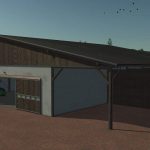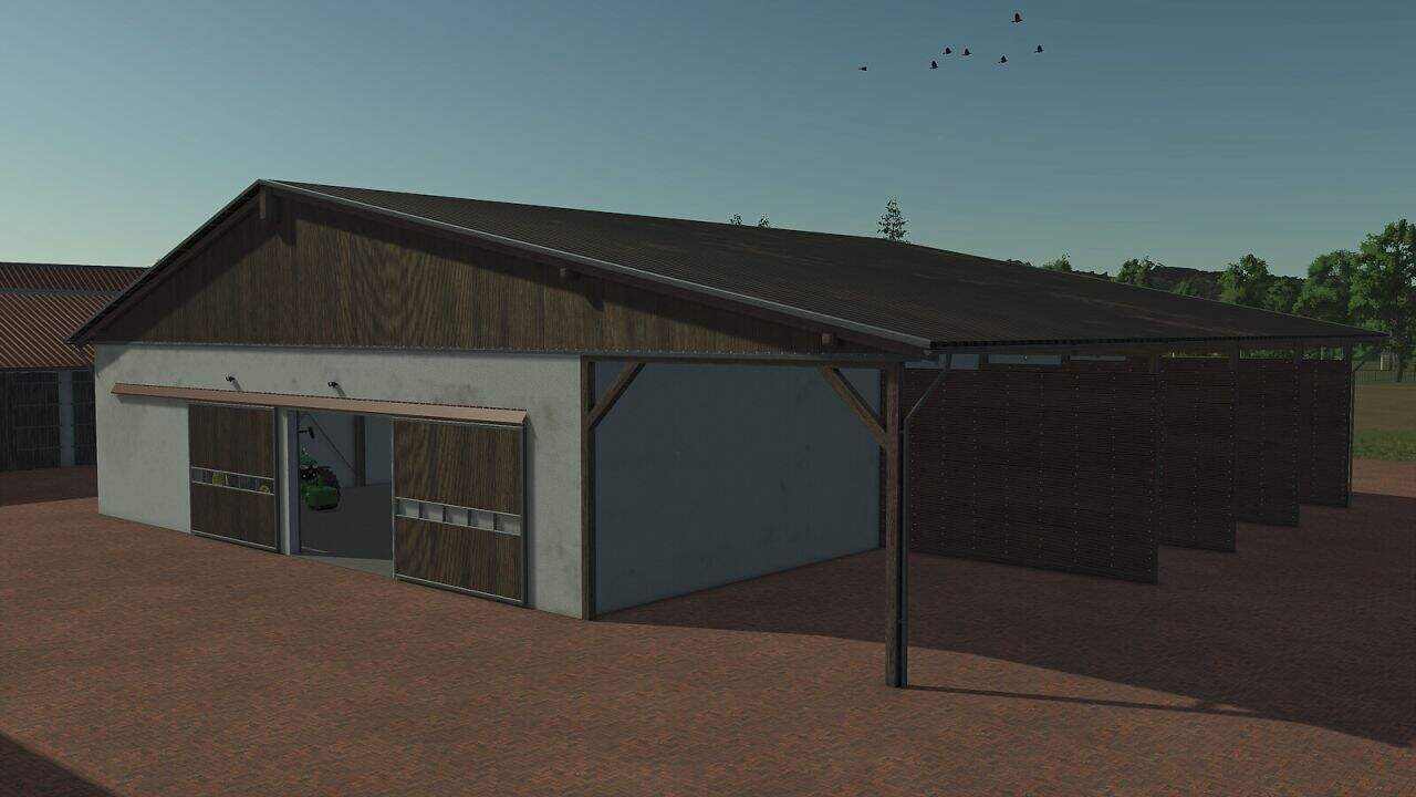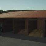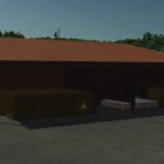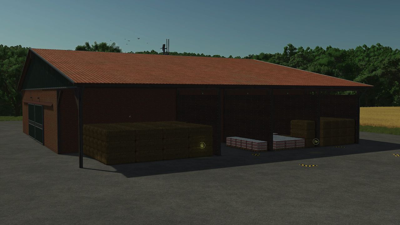 The barn offers a large, open interior space with four gates, ideal for storing machinery, trailers, or equipment. Outside, three configurable boxes are available, which can be used as a bale storage area, pallet storage, or bulk material bunker. To better fit different maps, you can choose between two regional visual styles. A versatile farm building that adapts to any yard.