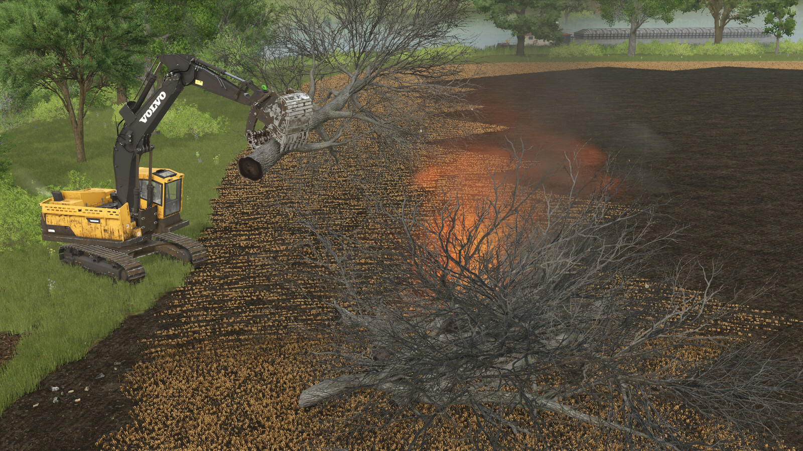 The Land Clearing Pack represents the way a lot of farmers in North America clean up and clear land to improve their fields and make them easier to farm. Consisting of a grapple bucket and a jerry can/fire this pack can help you quickly and easily take care of those trees in your way. It is designed for the Volvo Excavators from the Platinum Expansion but will also work on most other excavator mods as well.