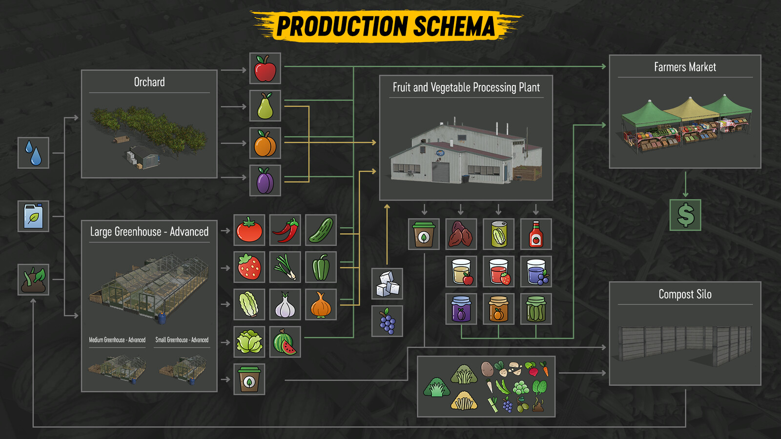 Extensive package of placeable production points and other placeables and related components all working together. Orchards producing fruits. Advanced greenhouses that require more attention for bigger productivity and with new fruits. Fruit and vegetable processing plant, Farmers market sell point, Compost silo and other components.