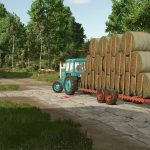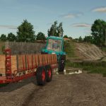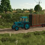 This machine is designed for loading fruit packed in containers, transporting them from between the rows of trees, and delivering them to storage and processing facilities for subsequent unloading.