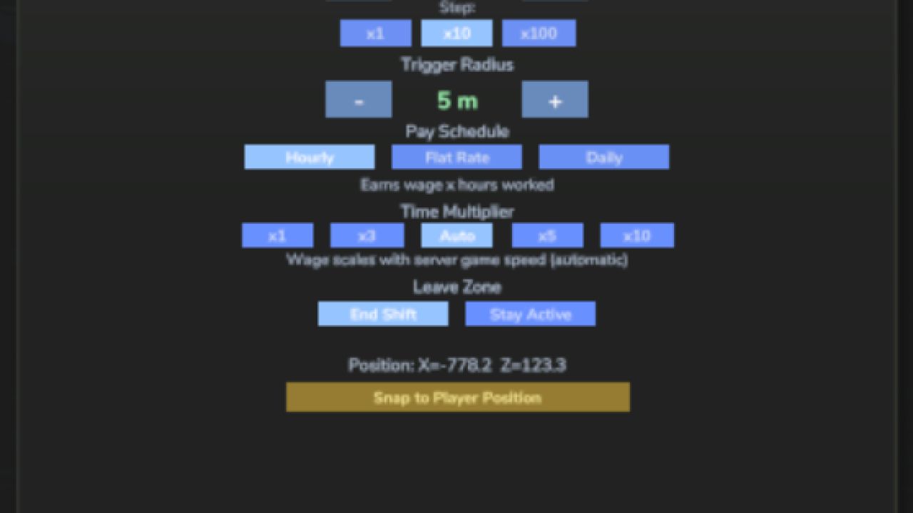 Turn any location on any map into a legitimate workplace. Open the Workplace Manager, add a trigger, give it a name and a wage, place it anywhere on the map — then walk in and clock in. Perfect for roleplayers who want their farmer to have a side job, or anyone looking to supplement farm income with off-farm work.